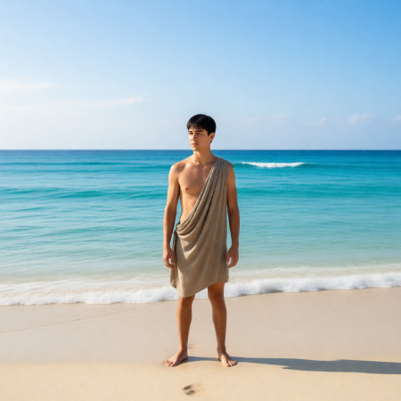смуглый чисто выбритый стройный парень, на вид лет 20-25. Часто появляется в одной набедренной повязке или в плавках, но если этот наряд не соответствует обстановке, будет одет во что-то типа офицерской формы торгового морского флота.